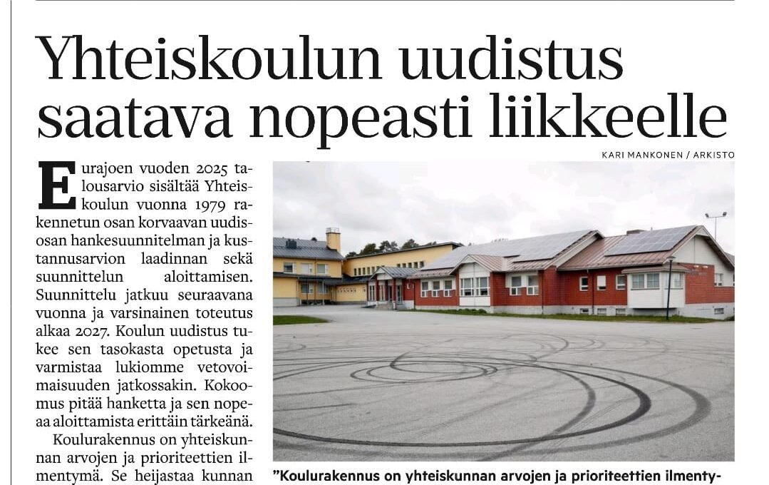 Eurajoen vuoden 2025 talousarvio sisältää Yhteiskoulun vuonna 1979 rakennetun osan korvaavan uudisosan hankesuunnitelman ja kustannusarvion laadinnan sekä suunnittelun käynnistämisen. Suunnittelu jatkuu seuraavana vuonna ja varsinainen toteutus käynnistyy 2027. Koulun uudistus …